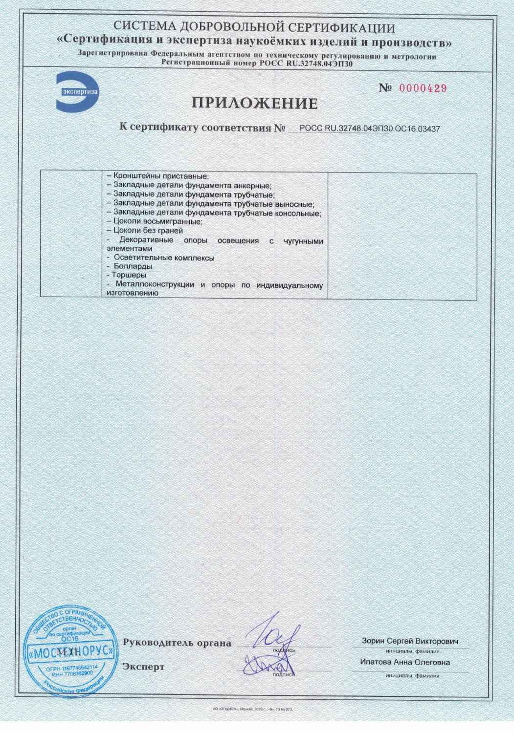 Приложение к сертификату соответствия
