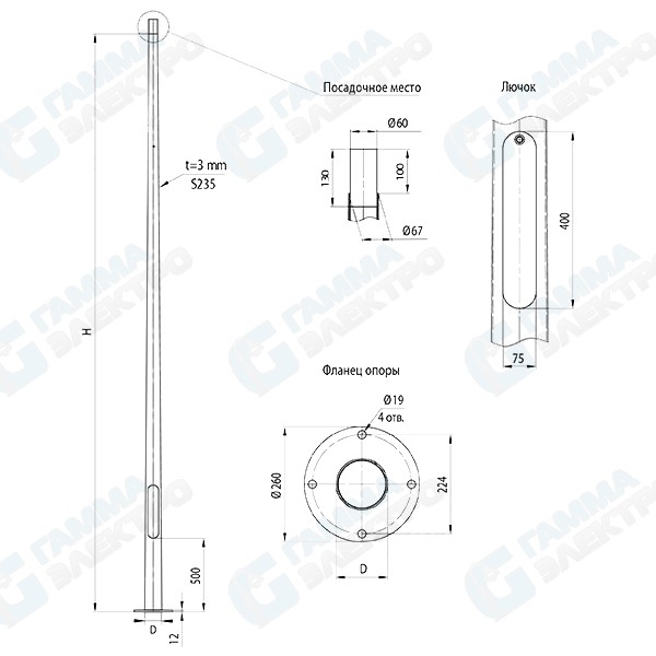 Декоративная круглоконическая опора «Бульвар» предназначена для организации освещения улиц, парков, скверов и пешеходных зон. Опора изготовлена из трехмиллиметровой стали, крепится к закладной детали фундамента с помощью фланцевого соединения, защищена от агрессивных воздействий окружающей среды горячеоцинкованным покрытием, также может быть дополнительно окрашена по желанию заказчика. На верхушку устанавливается светильник. В основании опоры находится технологический лючок. Высота изделия 6 метров. Закладные детали и монтажные аксессуары заказываются отдельно.