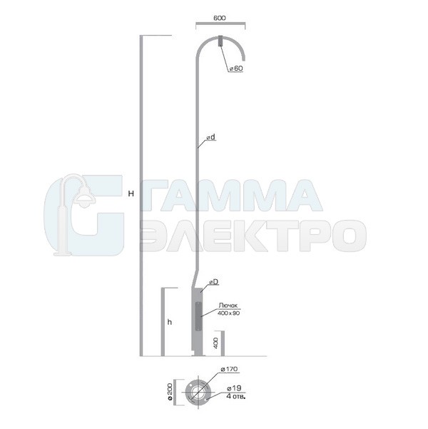 Декоративная опора «Гольф» имеет изящную форму, что позволяет ей органично вписываться в любой ландшафтный дизайн парковых ансамблей, мест отдыха и придомовых территорий. Опора изготовлена из стали, высота четыре метра. Крепится к закладной детали фундамента с помощью фланцевого соединения, защищена от агрессивных воздействий окружающей среды горячеоцинкованным покрытием, а также может быть дополнительно окрашена по желанию заказчика. В основании опоры находится технологический лючок. Закладные детали, светильники и монтажные аксессуары заказываются отдельно.