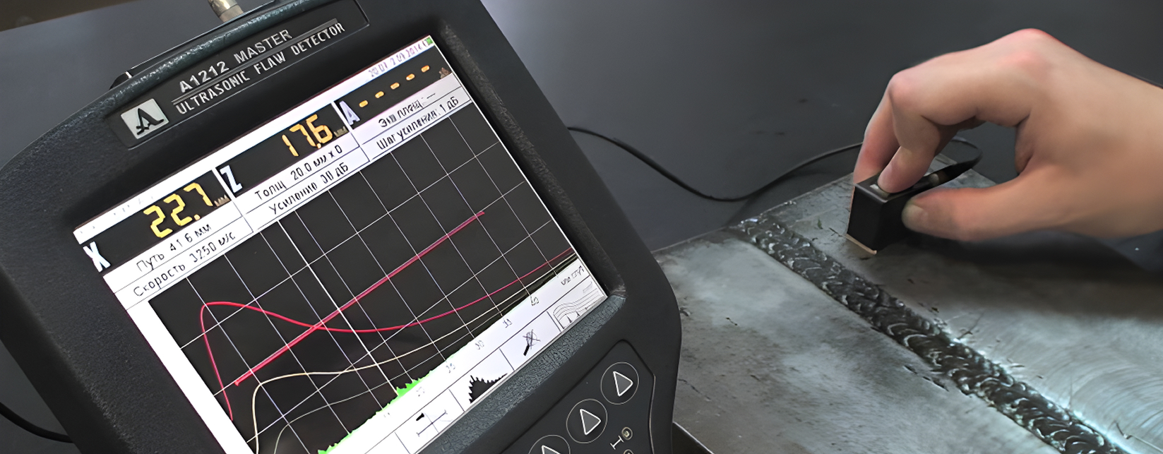 Метод на базе ультразвуковых волн. С его помощью выявляют скрытые дефекты, невидимые в иных ситуациях. Например, крупные шлаковые включения в нутрии шва. Такое соединение может казаться надежным и даже не пропускать жидкости, но его прочность будет крайне низкой.