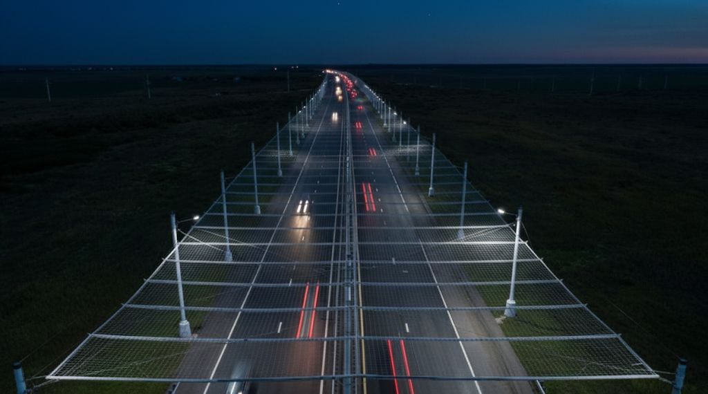 Опоры нередко являются основой контура безопасности. На них крепятся антидроновые сети, прикрывающие маршруты следования техники и пешеходов.