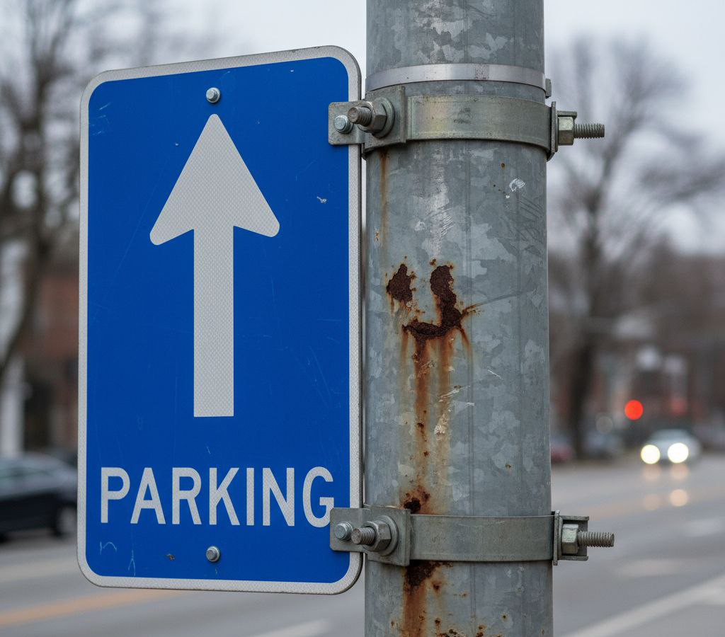 - На хомуты. Знак притягивается к стойке двумя стальными хомутами. Это самый простой метод, востребованный при установке временных ограничений. Однако при значительной удаленности опоры или обильной растительности на обочине требуется иной подход.